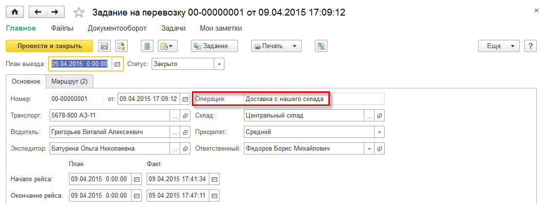 - указывать характеристики перевозки (вид транспорта, данные водителя, адрес и время доставки);