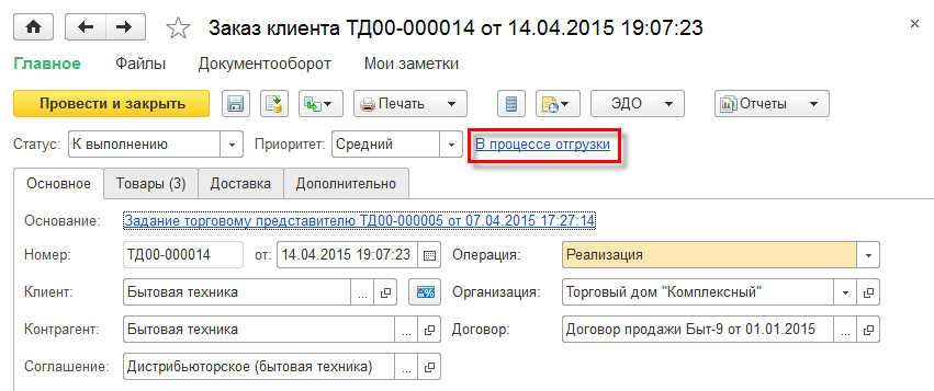 Процесс выполнения заказов можно контролировать с помощью соответствующих статусов и состояния документа. Состояние обновляется автоматически, пользователь может отслеживать ситуацию по заказу.