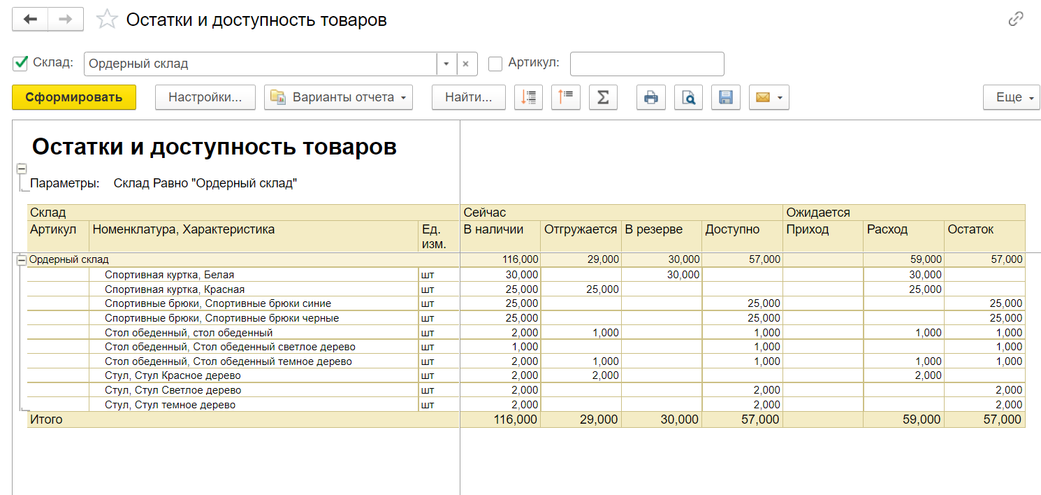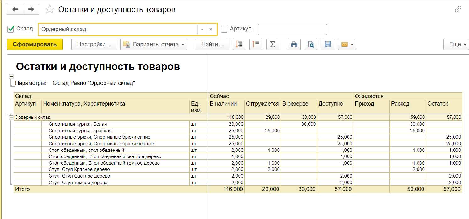 Форма «Остатки и доступность товаров» предназначена для контроля состояния запасов на складах компании. Сформировав отчетный документ, можно узнать, какие количество наименований отгружается (в обособлении или в резерве), какими заказами зарезервированы наименования.