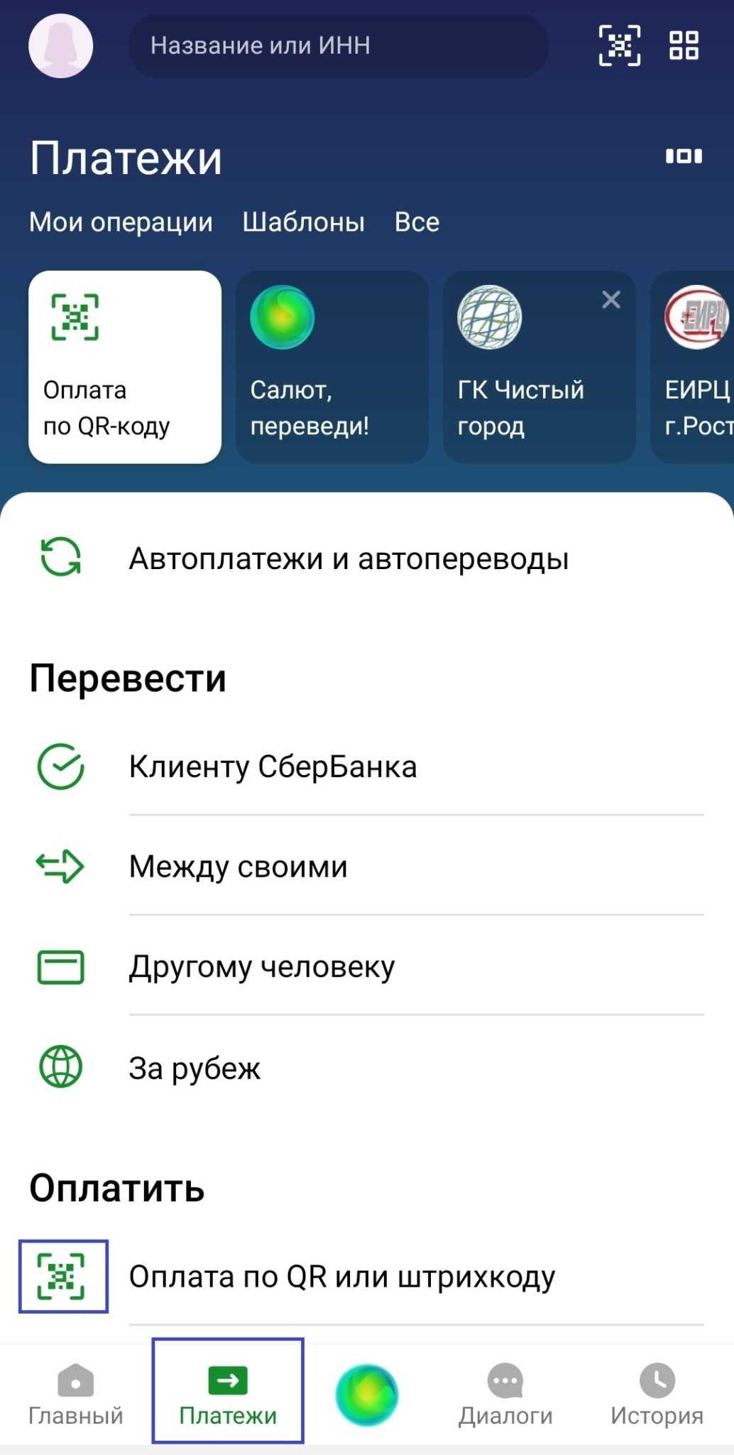 - Выбрать в списке «Оплата по QR-коду» и отсканировать кодик.