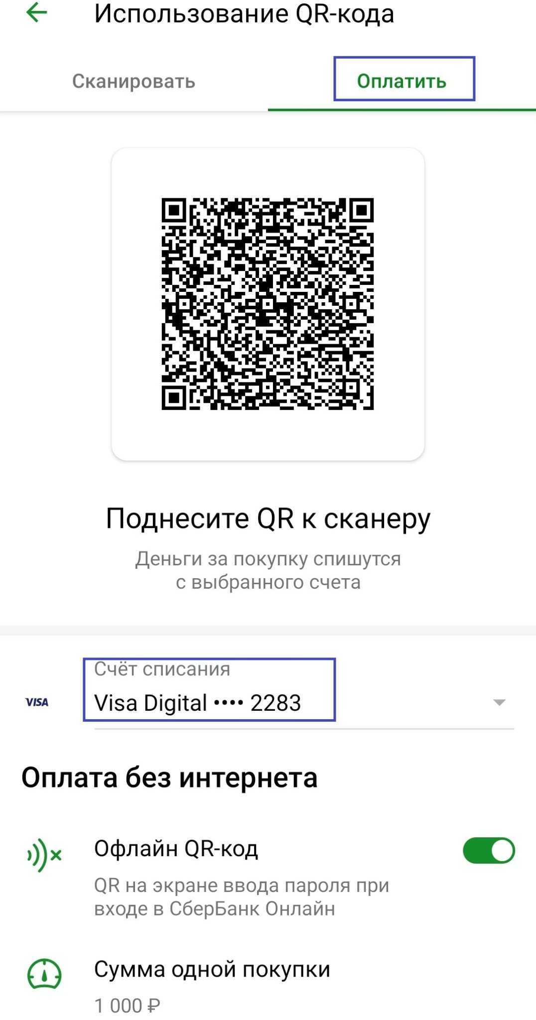 Если отсутствует подключение к интернету, можно воспользоваться функцией оффлайн QR-кода внизу экрана. Но им можно воспользоваться при условии, что сумма покупки не превышает 1000 рублей.