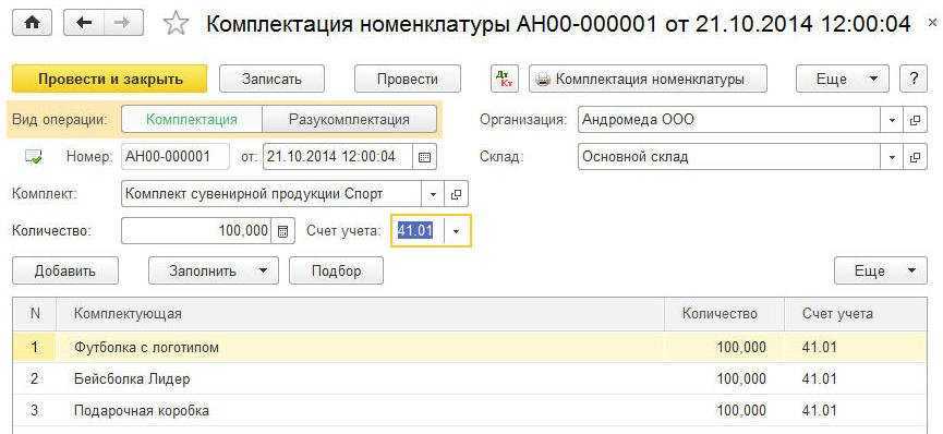 Подробнее об операции по комплектации номенклатуры см. в «Справочнике хозяйственных операций. 1С:Бухгалтерия 8» в разделе «Бухгалтерский и налоговый учет» ИС 1С:ИТС.