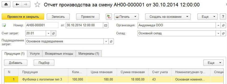 - Продукция — наименование выпущенной продукции (в нашем примере — Футболка с логотипом тип 3);