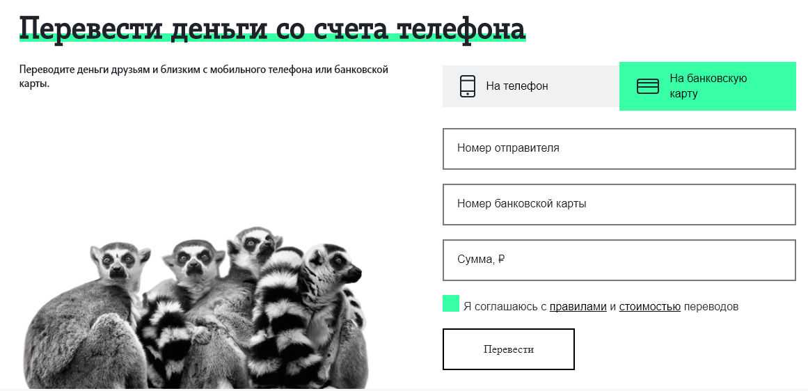Для абонентов сети доступны переводы между счетами. Это позволяет напрямую пополнять баланс, минуя зачисление на карту.