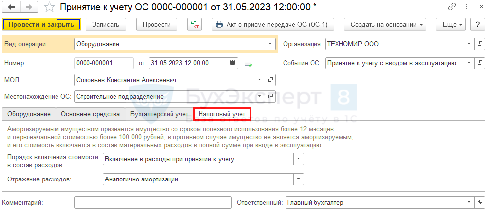 - Порядок учета — Начисление амортизации, т. к. в нашем примере стоимость ОС в БУ погашается посредством начисления амортизации;