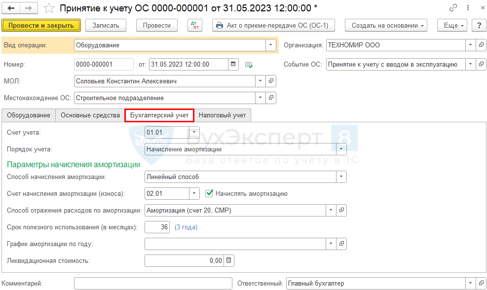 - Срок полезного использования (в месяцах) — укажите период проведения ТО (в нашем примере — 36 мес).