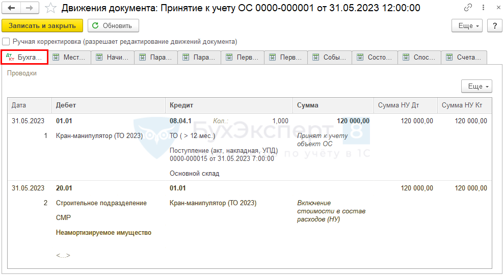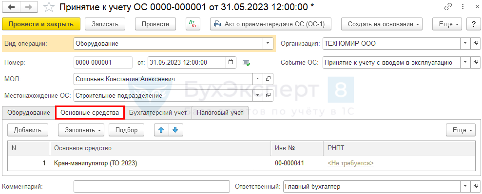 На вкладке Основные средства выберите специально созданный предварительно для этого элемент справочника Основные средства, например Кран-манипулятор (ТО 2023).