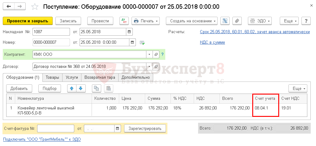 Оформим документ Поступление (акт, накладная) вид операции Оборудование в разделе ОС и НМА – Поступление основных средств – Поступление оборудования.
