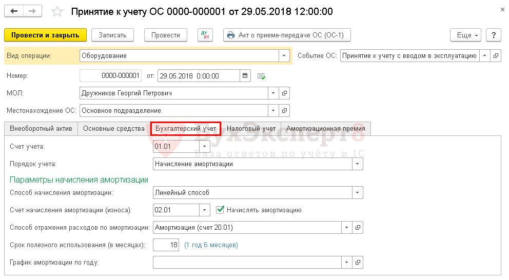 На вкладке Бухгалтерский учет отразите параметры начисления амортизации в БУ.