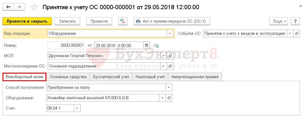 оприходование и ввод в эксплуатацию ОС — документ Поступление (акт, накладная) вид операции Основные средства.