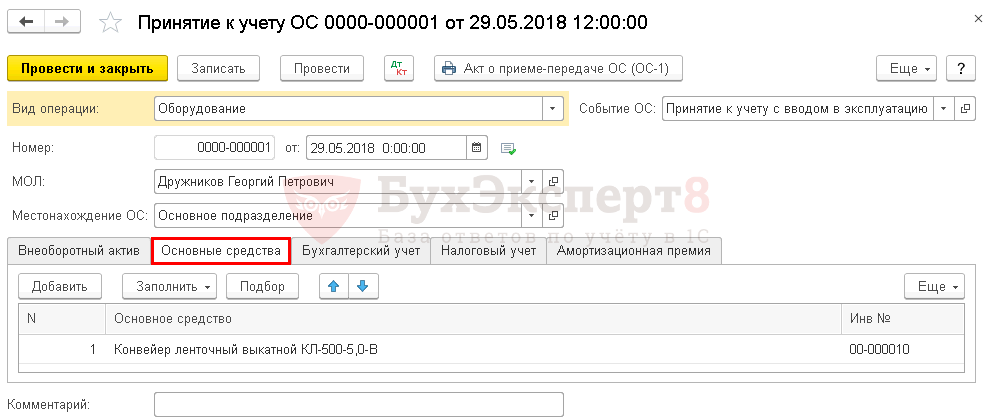 На вкладке Основные средства заполните ОС, принимаемое к учету, задайте инвентарный номер.