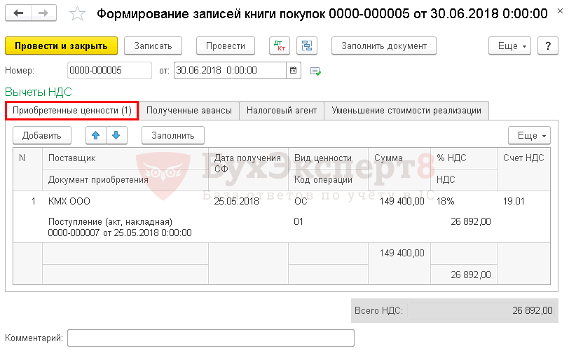 Примите НДС к вычету документом Формирование записей книги покупок в разделе Операции — Закрытие периода — Регламентные операции НДС — вкладка Приобретенные ценности.