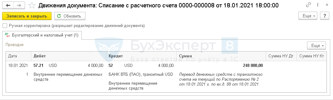 - Перевод валюты с транзитного на текущий счет