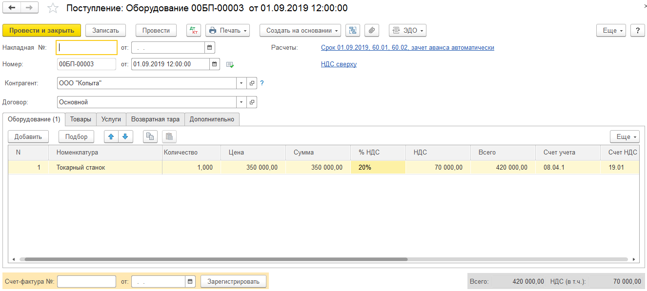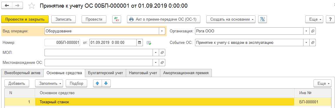 Когда будет выполнено проведение, документ относит токарный станок, который в нашем примере стоит триста пятьдесят тысяч рублей, на нужный счёт.