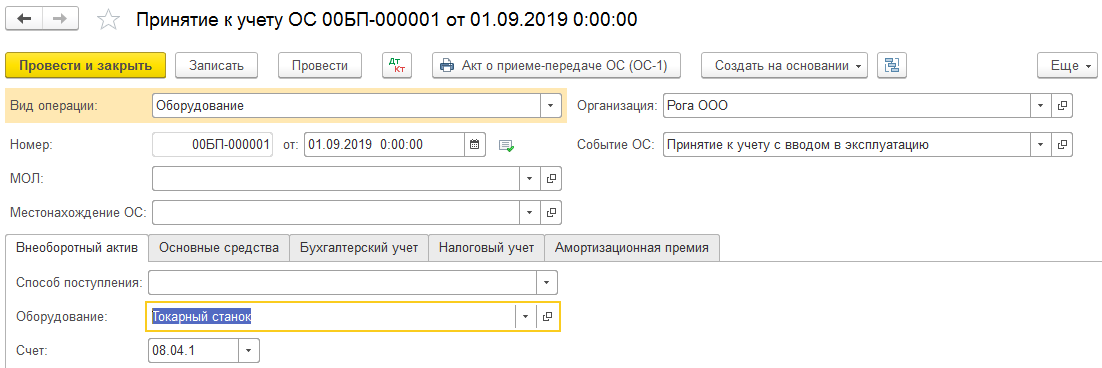 Пусть токарный станок числится на 08.04.01 (для примера, это пригодится ниже при рассмотрении амортизации).