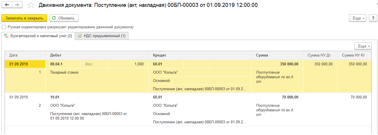 Если всё было сделано в полном соответствии с написанной выше инструкцией, то в итоге должны быть сформированы 2 различные бухгалтерские проводки.