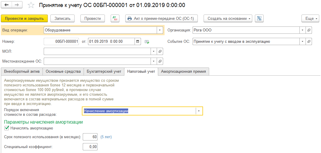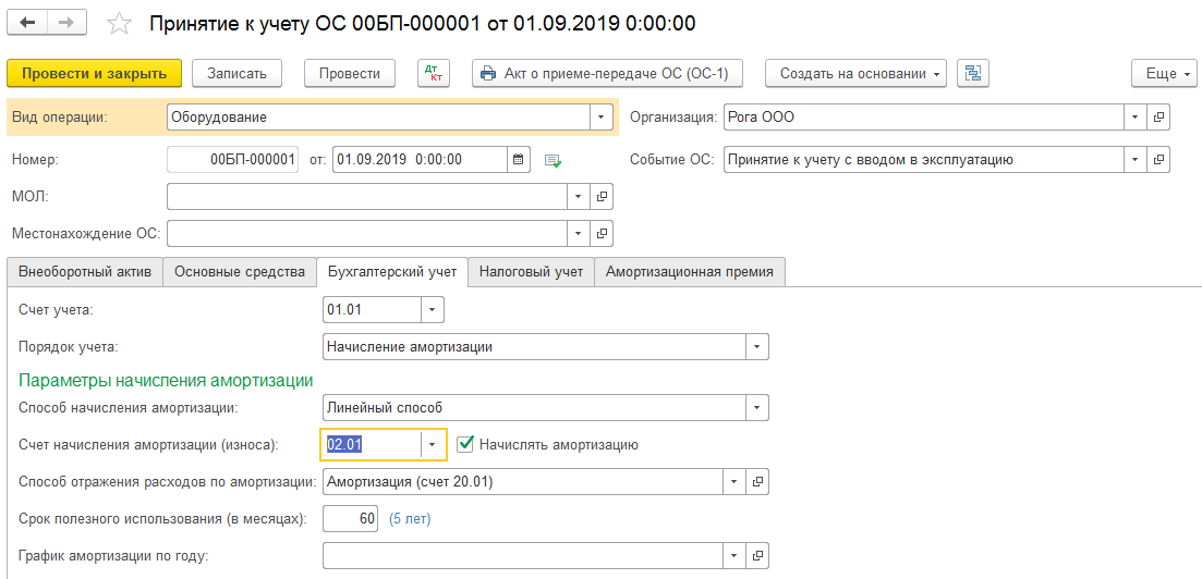 В нашем примере приобретённый станок будет использоваться пять лет, то есть шестьдесят месяцев, а начисление амортизации проходить линейным способом. Таким образом вся сумма будет одинаковыми частями списываться все эти пять лет, когда будет закрываться месяц.