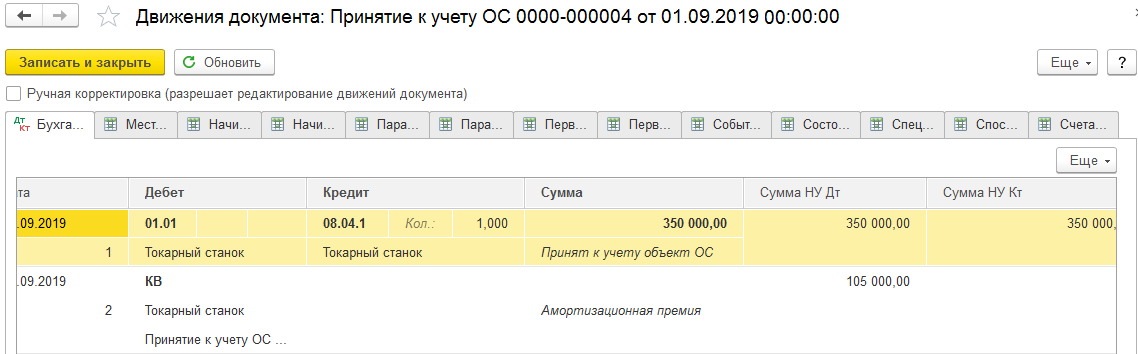 В первой проводке будет само принятие нашего станка к учёту с отметкой суммы (триста пятьдесят тысяч рублей). Во второй же строке движений будет отмечена амортизационная премия в 30% – по деньгам получается сто пять тысяч рублей.
