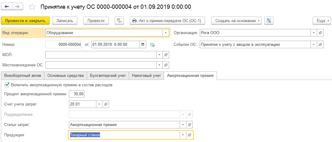 В последней вкладке заполняются данные про амортизационную премию. Процент указывается по группе, в которую наше основное средство (станок) должно включаться по сроку использования. У нас она будет 30%.