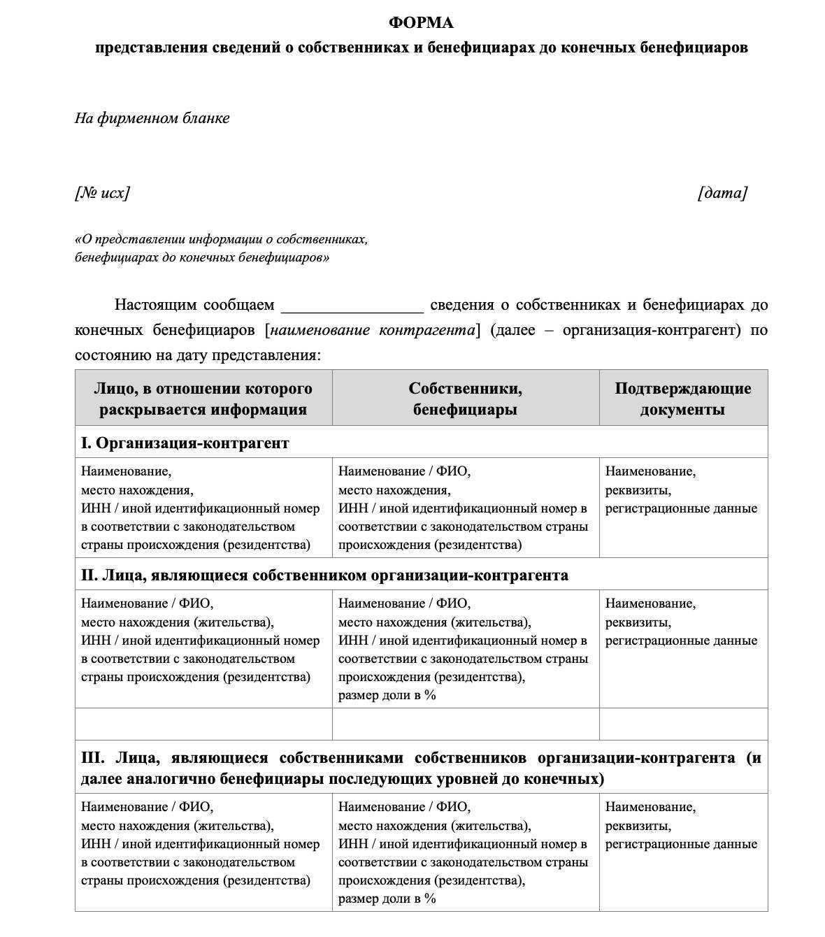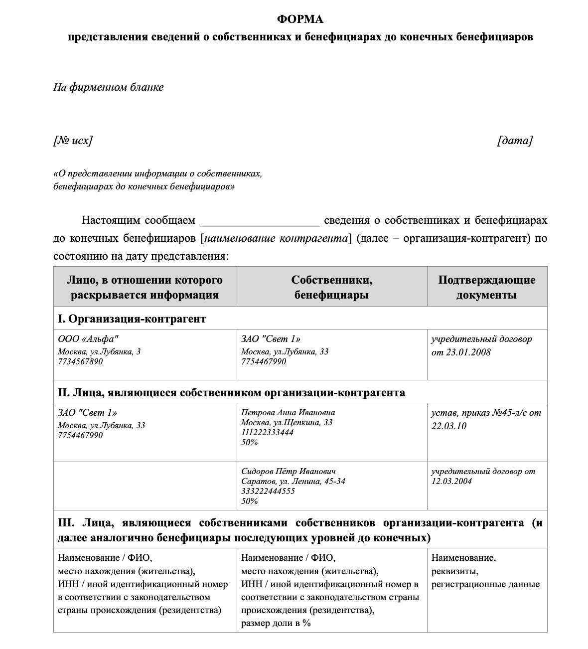 Справка (сведения) о бенефициарных владельцах: образец заполнения
