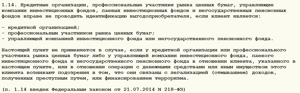 В этом же федеральном законе прописывается обязанность банков и других финансовых учреждений, занимающихся операциями с денежными средствами, выявлять бенефициарных владельцев. В законе также указываются особенности выявления этих лиц.