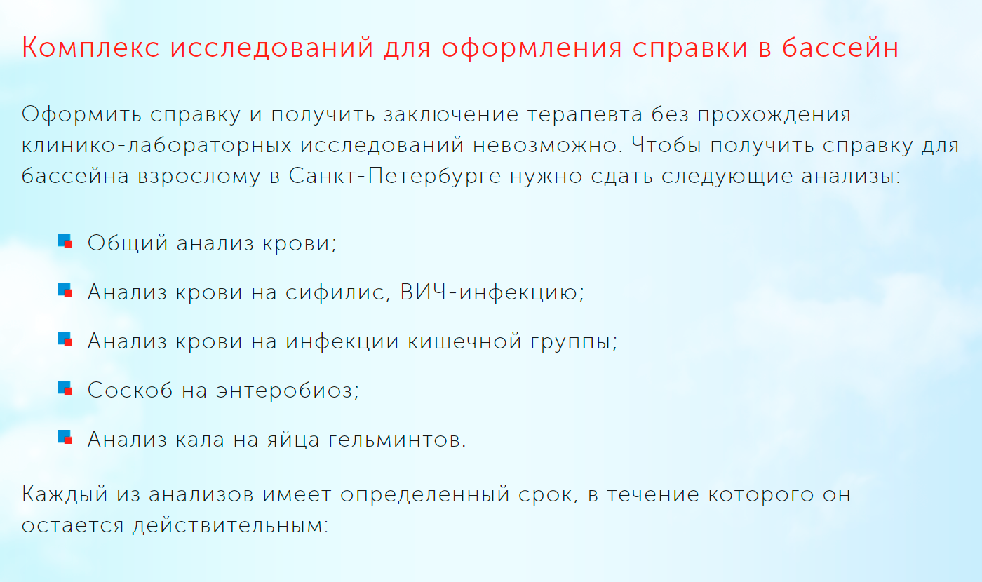 Из всего вышеперечисленного можно узнать, что нужно для справки в бассейн взрослому и ребенку, какие анализы необходимо сдать, и сколько это будет стоить.