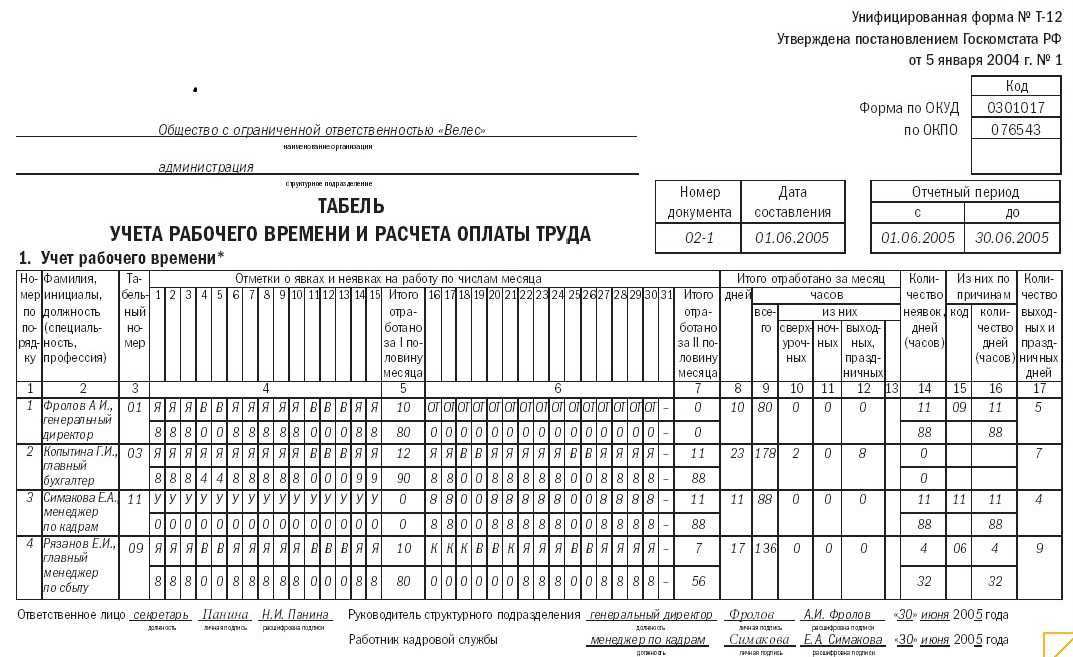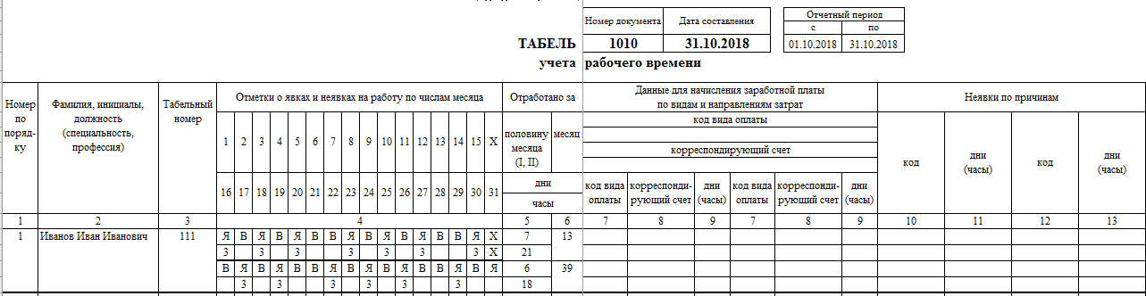 При заполнении табеля ежедневно по каждому сотруднику указываются отработанные часы и условное обозначение, например: