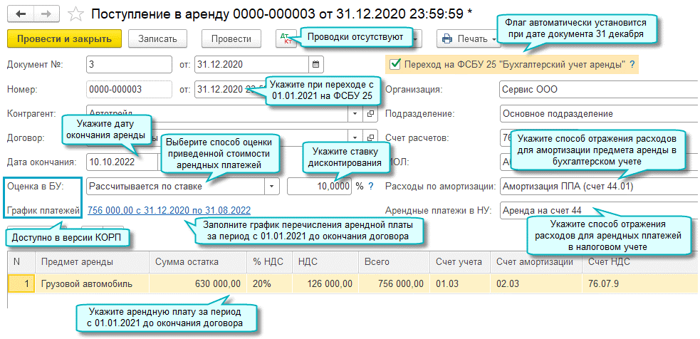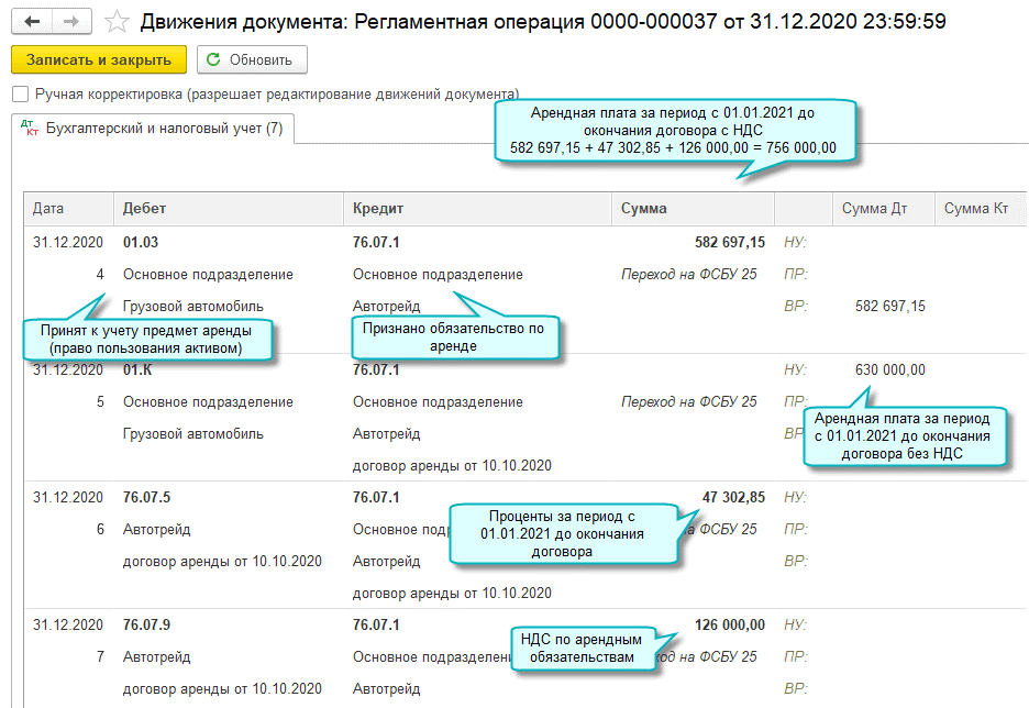 Чтобы внести изменения, нужно использовать специальную регламентную операцию «Переход на ФСБУ 25». Она вводится вручную, когда отчетность будет сдана за год, который предшествовал переходу на ФСБУ 25/2018.