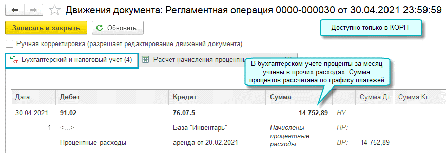 Для полного интерфейса нужно зайти в раздел «Операции», затем выбрать «Закрытие периода», далее перейти в «Закрытие месяца» и затем уже выбрать «Начисление процентных расходов».