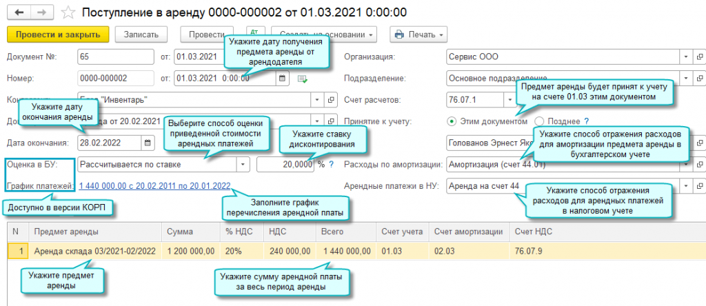 Учет платежей арендодателя и оказания услуг отображается в бухгалтерском учете компании, в зависимости от основной деятельности юридического лица, указанного в ЕГРЮЛ.