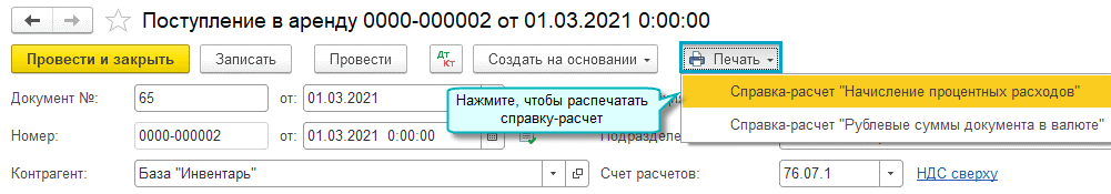 Бухгалтерские записи по принятию к учету затрат на аренду, а также по расчетам с арендодателем производятся в порядке, установленном Инструкцией по применению Плана счетов бухгалтерского учета финансово-хозяйственной деятельности организаций, утвержденной Приказом Минфина России от 31.10.2000 N 94н, и приведены ниже в таблице проводок. Содержание операций Дебет Кредит Сумма, руб. Первичный документ Ежемесячно в течение срока действия договора аренды Отражены в составе расходов арендные платежи за текущий месяц 20 76 80 000 Договор аренды, Счет за аренду, Бухгалтерская справка Произведена оплата по договору аренды 76 51 80 000 Выписка банка по расчетному счету