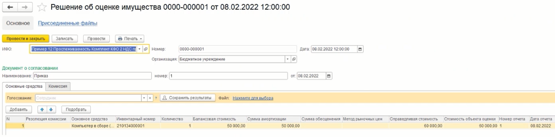 Для отражения принятого решения об оценке имущества в программе используется документ «Решение об оценке имущества», где указывается дата, документ о согласовании, объект ОС, его балансовая и справедливая стоимость.