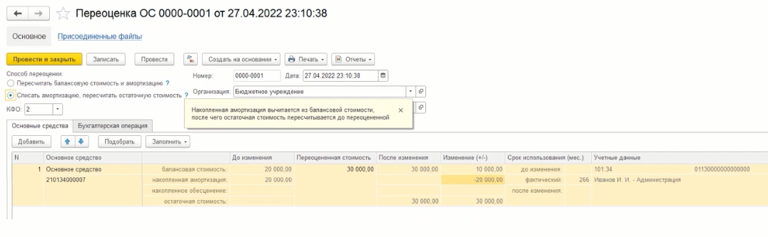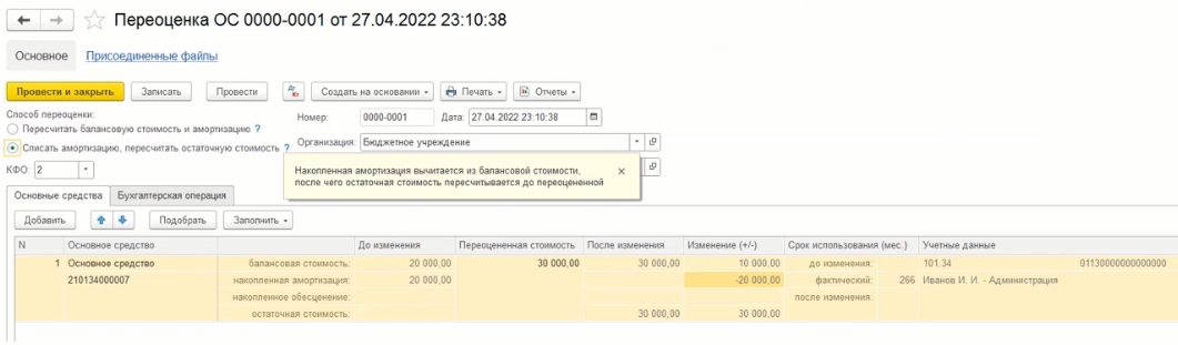 Когда получено решение об оценке и оформлено, далее можно произвести переоценку ОС. Сделать это можно с помощью документа «Переоценка ОС».