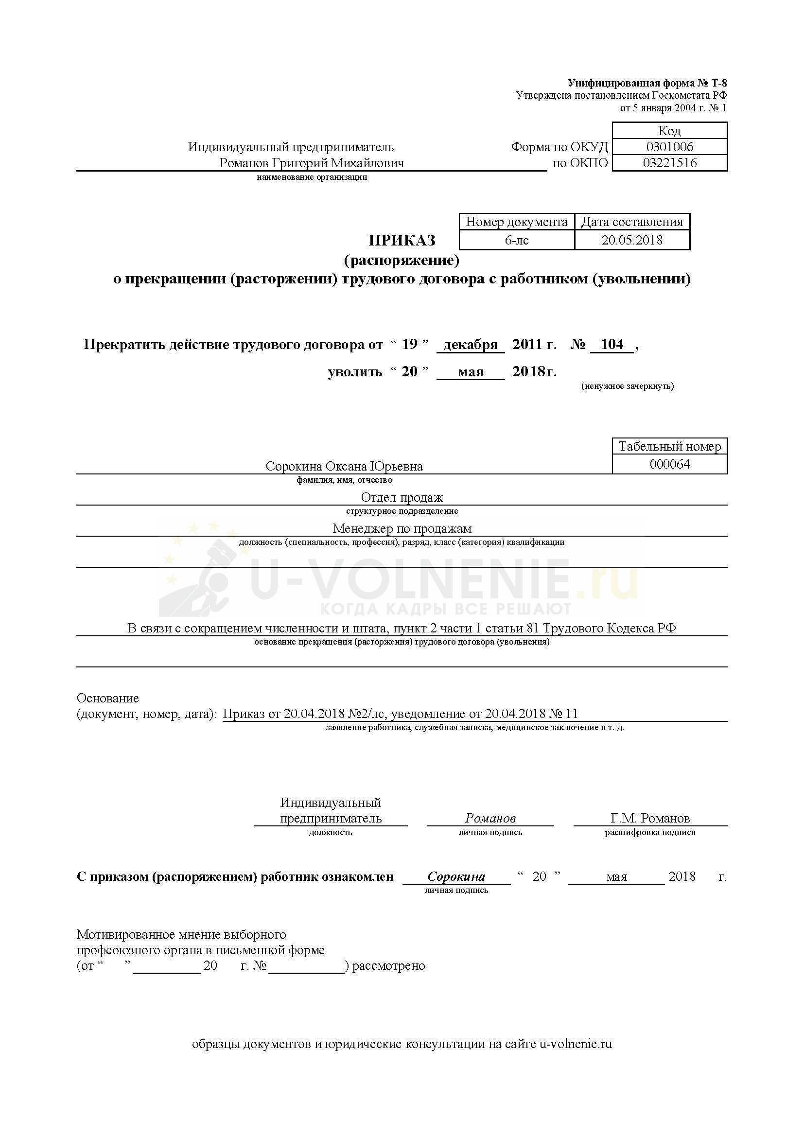 образец записи в трудовой об увольнении по сокращению работника ИП