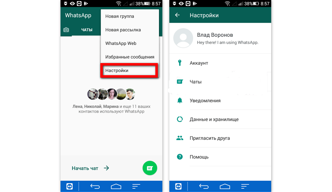 - входим в настройки приложения, тапнув по трём точкам вверху окна WhatsApp;