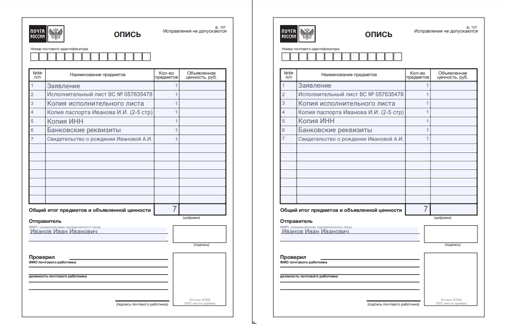 Первым делом нужно заполнить опись вложения в двух экземплярах. Один экземпляр оправится в письме, другой останется вам. Опись можно заполнить онлайн на официальном сайте Почты РФ, но для этого нужно зарегистрировать личный кабинет. Есть и другие сервисы в интернете. А есть способ еще проще, так как я для вас подготовил чистый бланк описи, который можно просто скачать и заполнить.
