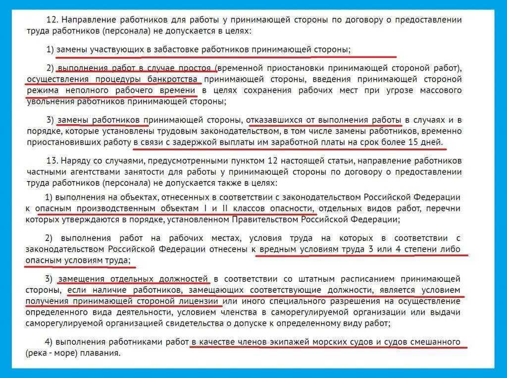 Аутстаффинговая компания может предоставить работников не во всех случаях. Так, она не вправе предоставлять персонал, нанимаемый в целях, указанных в пунктах 12 и 13 статьи 18.1.