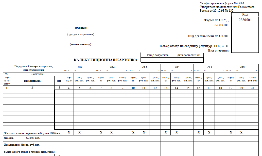 Форма ОП-1, называемая также калькуляционной карточкой, используется как инструмент документальной фиксации продажной цены того или иного блюда либо изделия, выпускаемого предприятием общепита. В структуре формы ОП-1 присутствуют пункты, позволяющие отразить:
