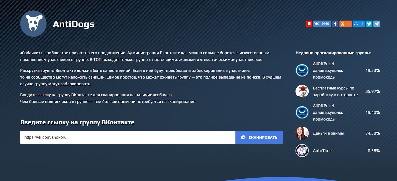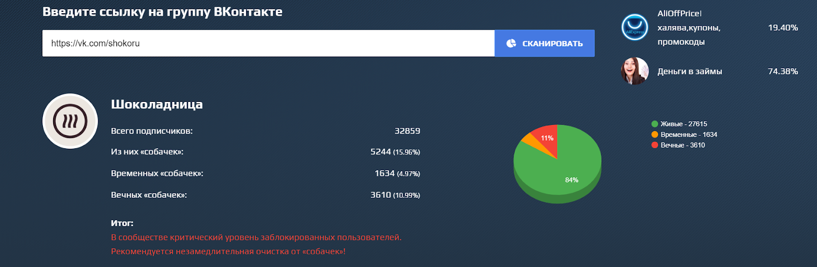 Указываете ссылку на группу «ВКонтакте», жмете «Сканировать» и получаете отчет по количеству «собачек» (заблокированных пользователей) среди подписчиков.