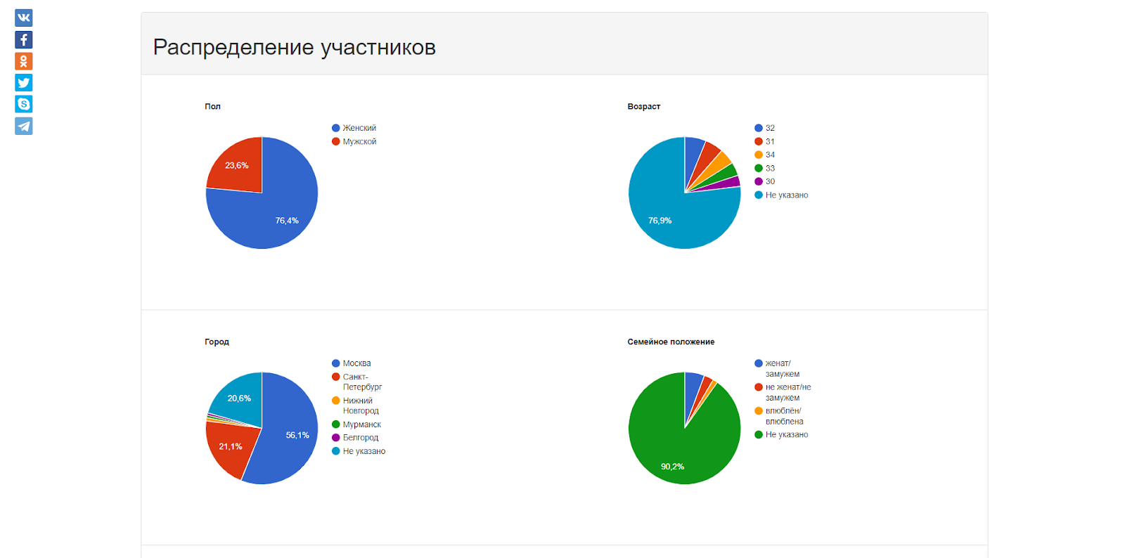 Показывает распределение участников сообщества по полу, возрасту, городу и семейному положению.