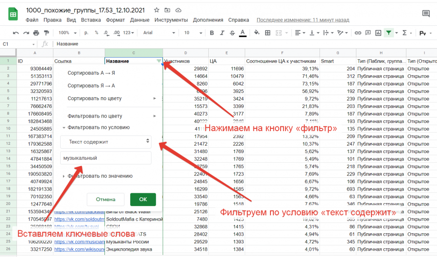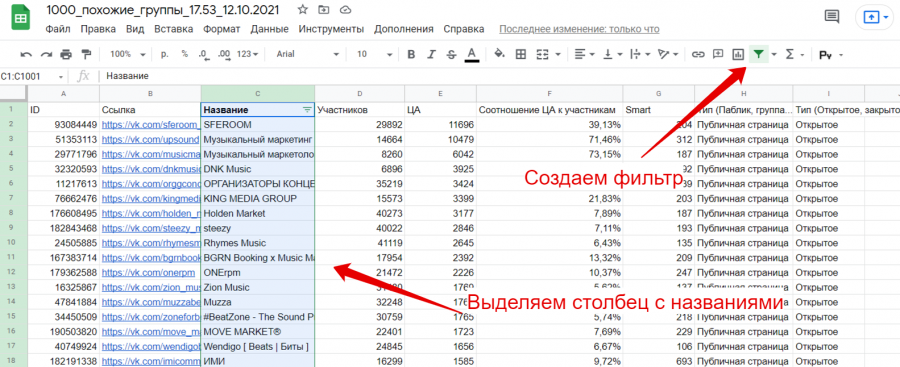 Теперь с помощью фильтра и найденных ключей будем сегментировать аудиторию собранных ранее целевых сообществ. Делаем это так:Берем результат самой первой задачи «Похожие группы» и скачиваем его в виде файла CSV
