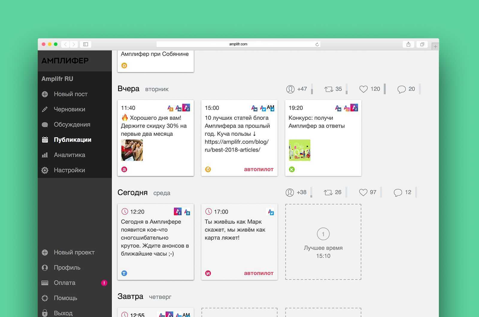 В функциональности ничего особенного: настройка публикаций по расписанию, импорт записей с сайта, разметка UTM и т. д.