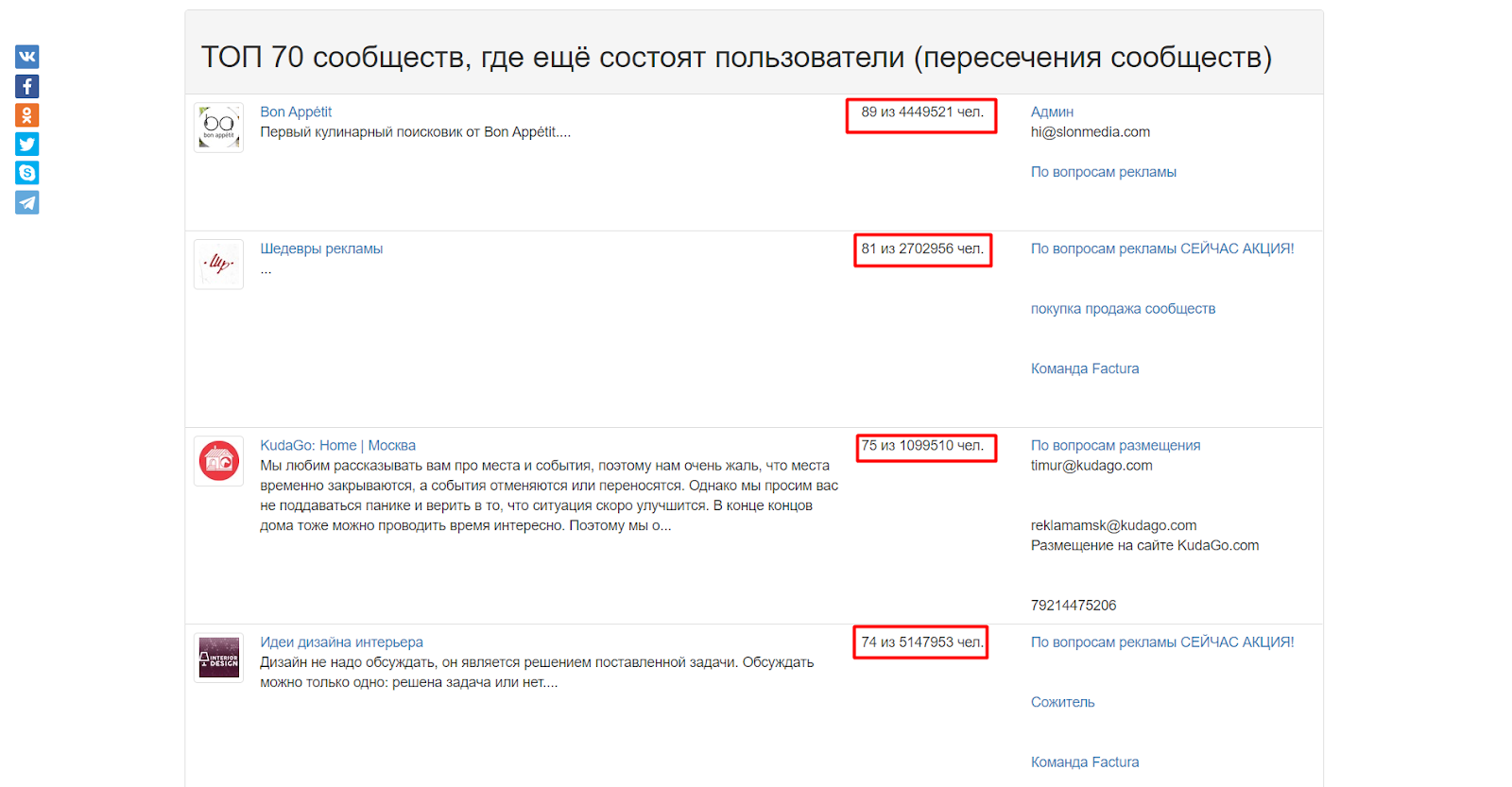 Дополнительно сервис показывает топ других сообществ, в которых состоят пользователи из анализируемого сообщества. Плюс, доступны данные по пересечению аудитории: