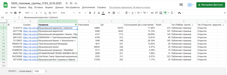4. Нажимаем «импортировать данные» и «открыть сейчас», получаем готовую табличку с похожими на нашу группами.