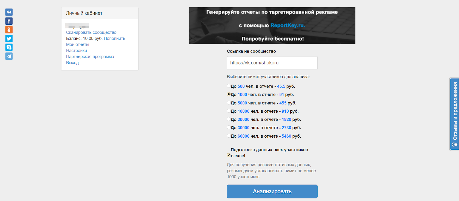 В сервисе вы платите за каждое сканирование сообщества. Стоимость сканирования зависит от количества участников сообщества, которых проанализирует сервис. Самый дешевый вариант, до 500 участников в отчете — 45,5 рублей.