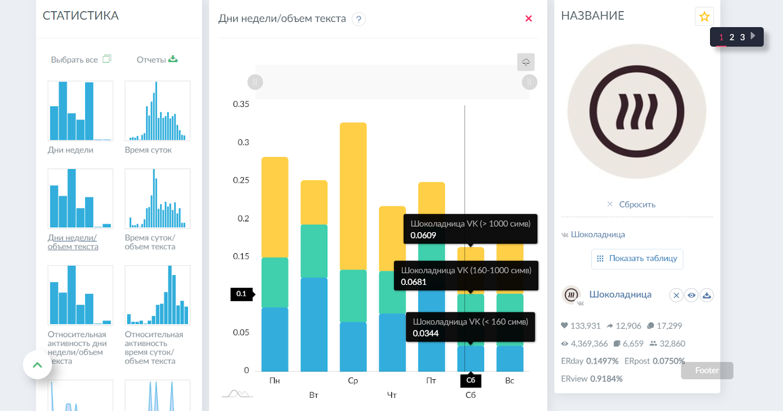 Более 20 статистических отчетов. Например, можно посмотреть статистику по эффективности публикаций с разным объемом текста в разрезе дней недели.