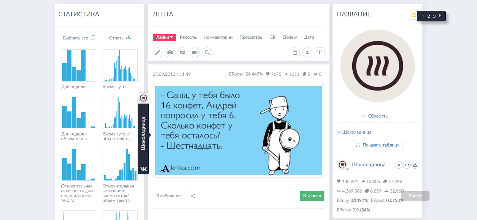 Русскоязычный сервис аналитики постов и страниц в соцсетях.