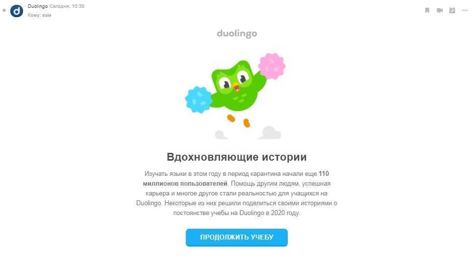 Например, сервис для изучения языка Duolingo периодически напоминает о себе тем, кто уже проходил обучение, но по каким-то причинам забросил его.