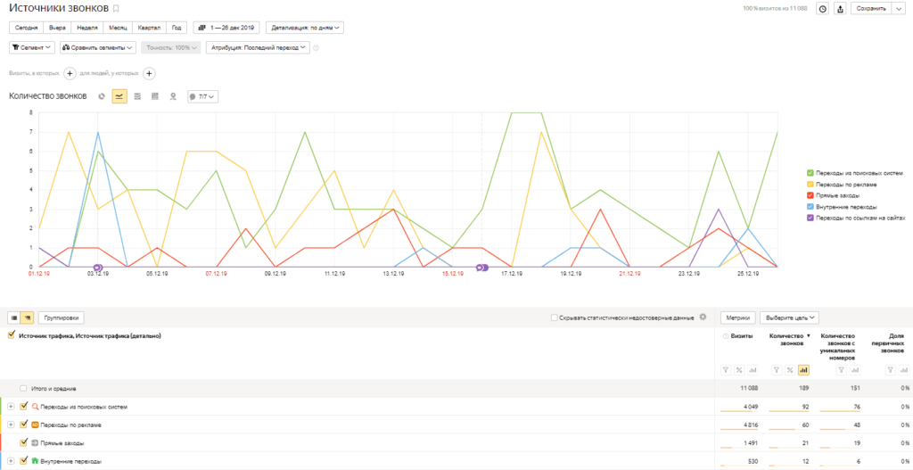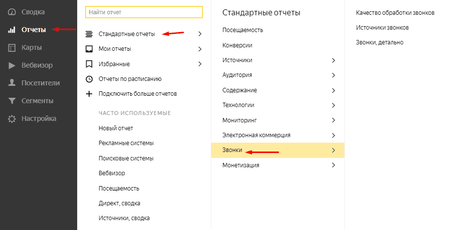 Для анализа статистики достаточно посетить отчеты Метрики, где в «Стандартных отчетах» в блоке «Звонки» можно получить следующие отчеты: