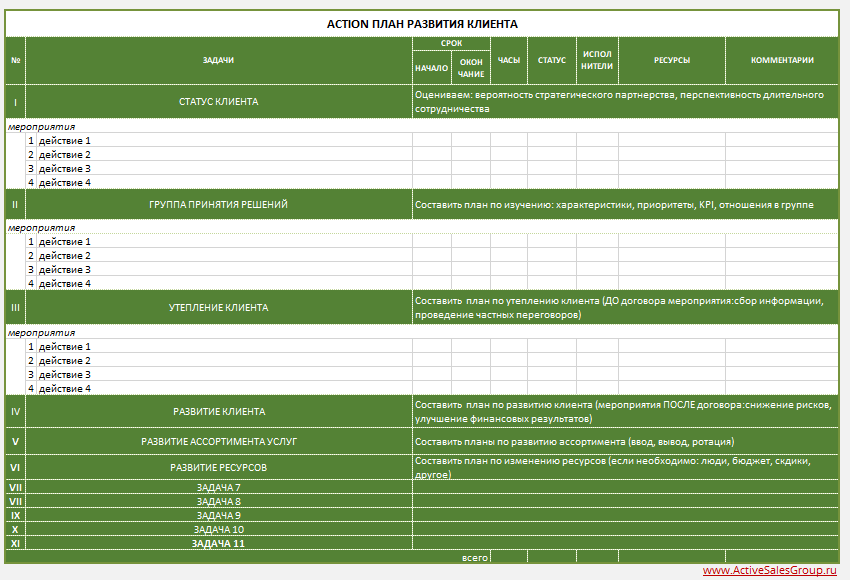 План действий по развитию клиентов мы используем в своих проектах по развитию отделов продаж. План формирует мероприятия по следующим направлениям: